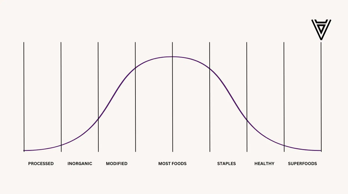 Based on the 100 most-studied, most nutrient-dense foods on the planet, each segement represents how far a food is from an average nutritional value. Veles Vitality foods are beyond better. You might even say they’re the best.